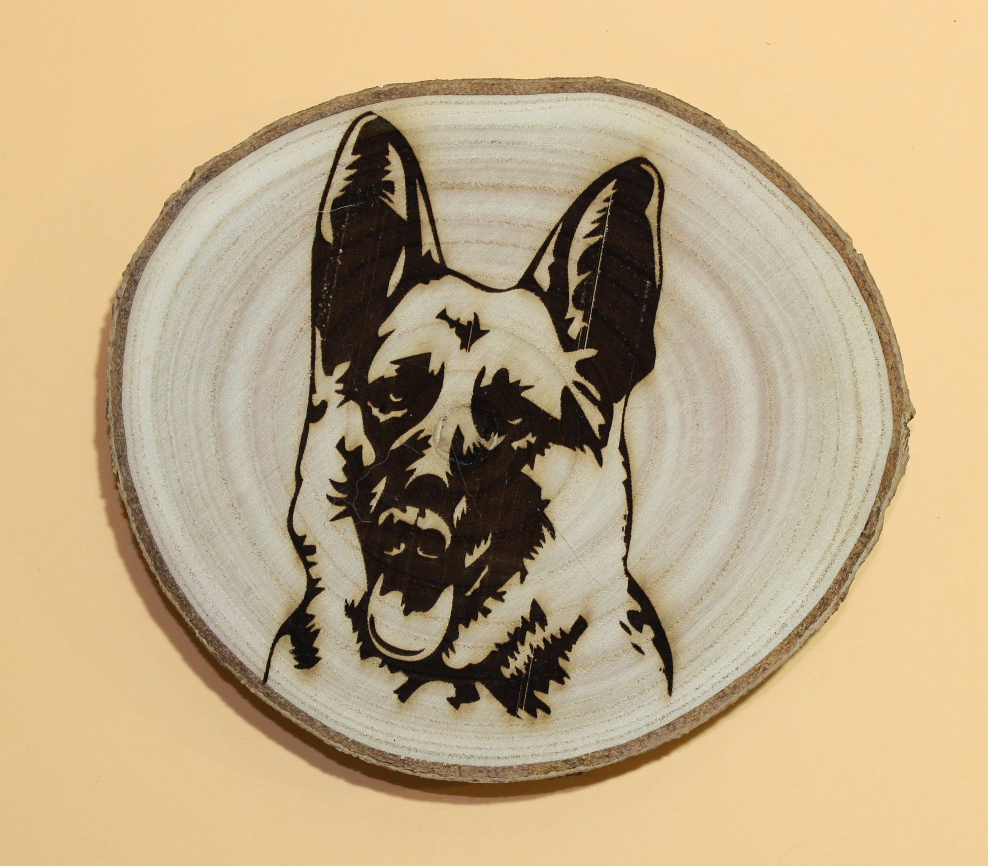 Ein echtes Stück Natur für Ihr Zuhause! Diese handliche Baumscheibe aus echtem Echtholz mit Rinde bringt rustikalen Charme und die Treue des Deutschen Schäferhundes perfekt zusammen.